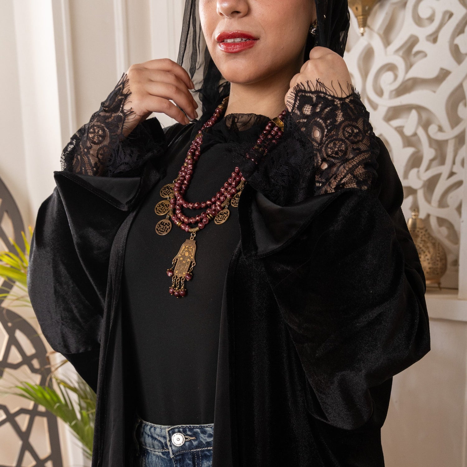 Vera Velvet & Lace Open Abaya | Black