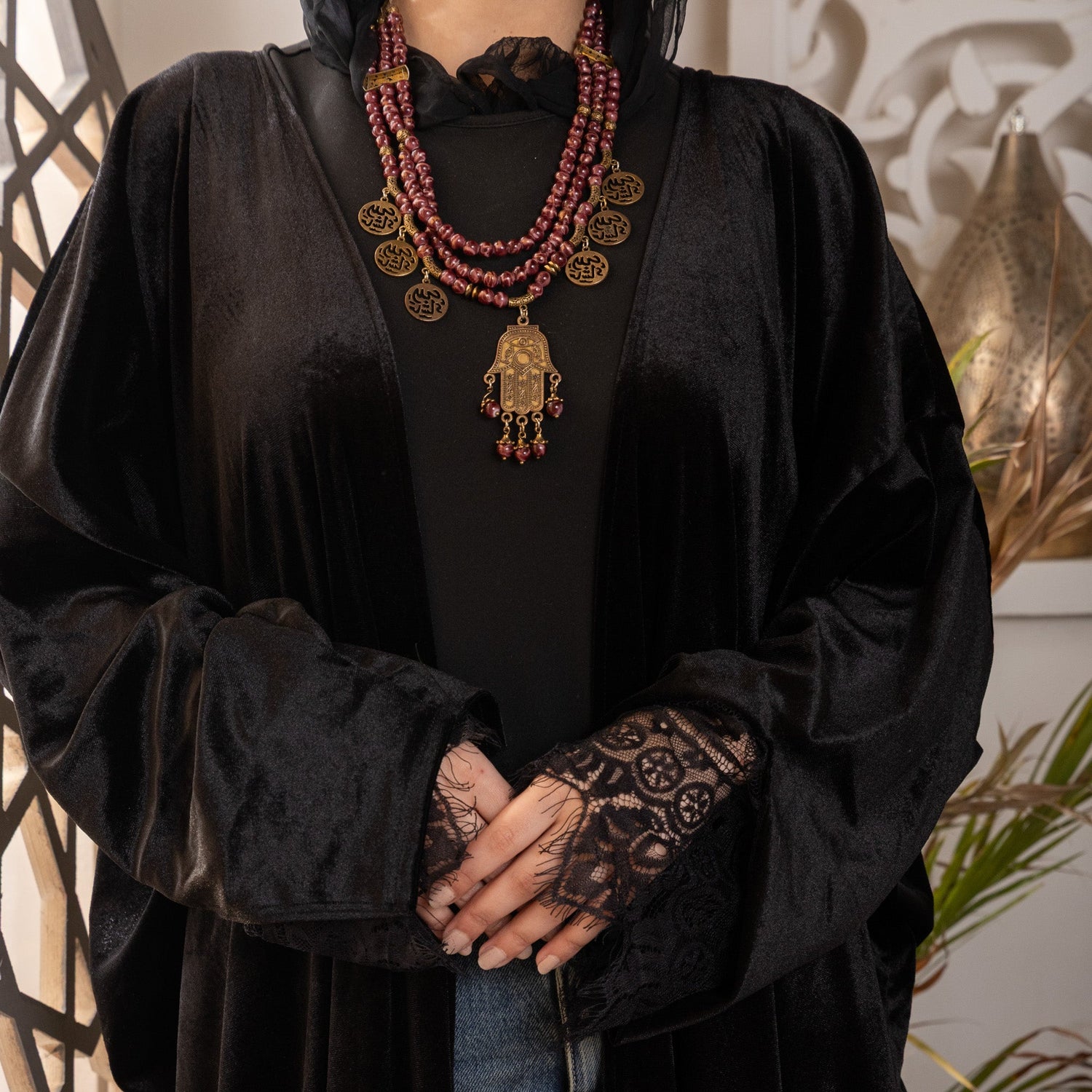 Vera Velvet & Lace Open Abaya | Black