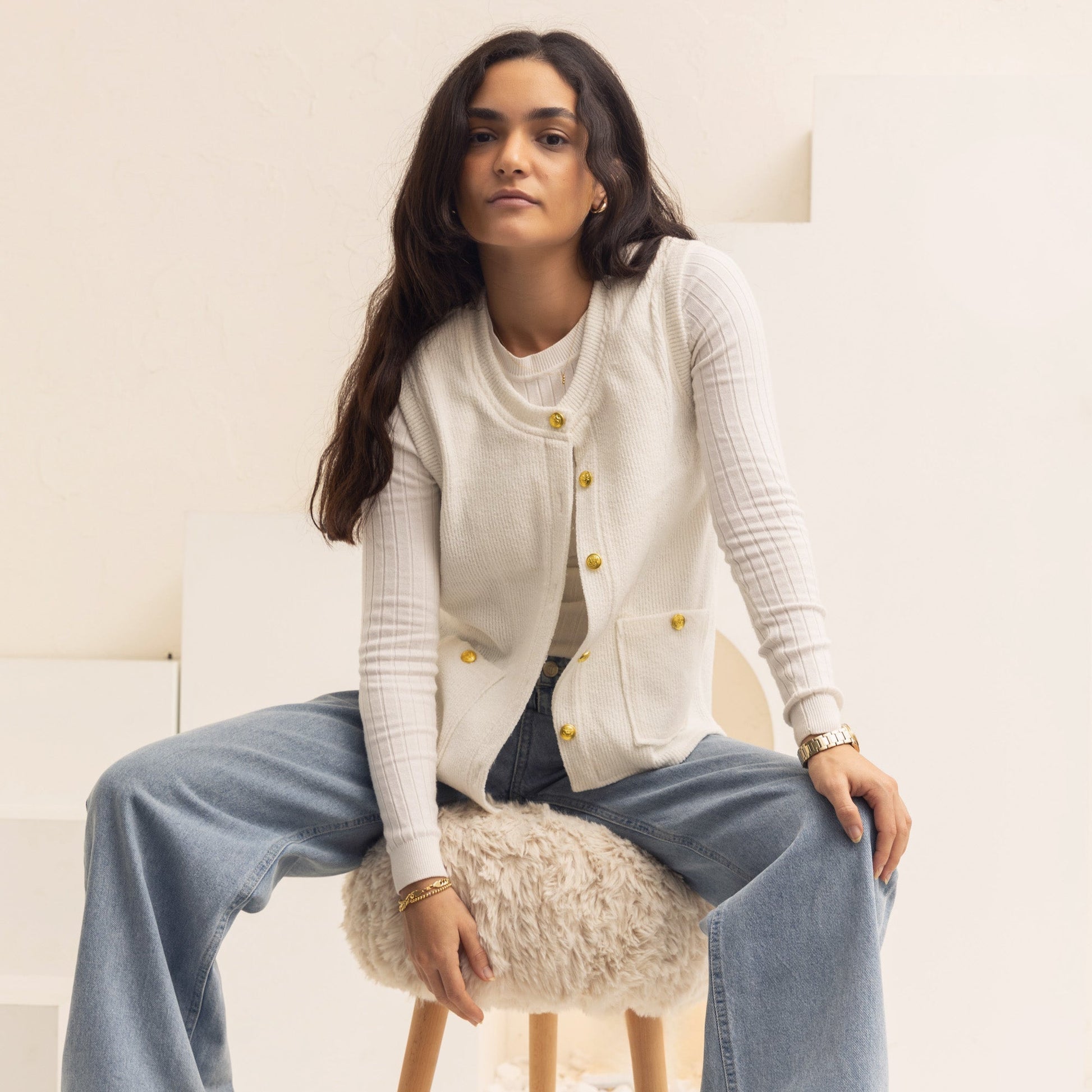 Soft knit vest, in offwhite shade and finished with gold-tone buttons for a refined touch.